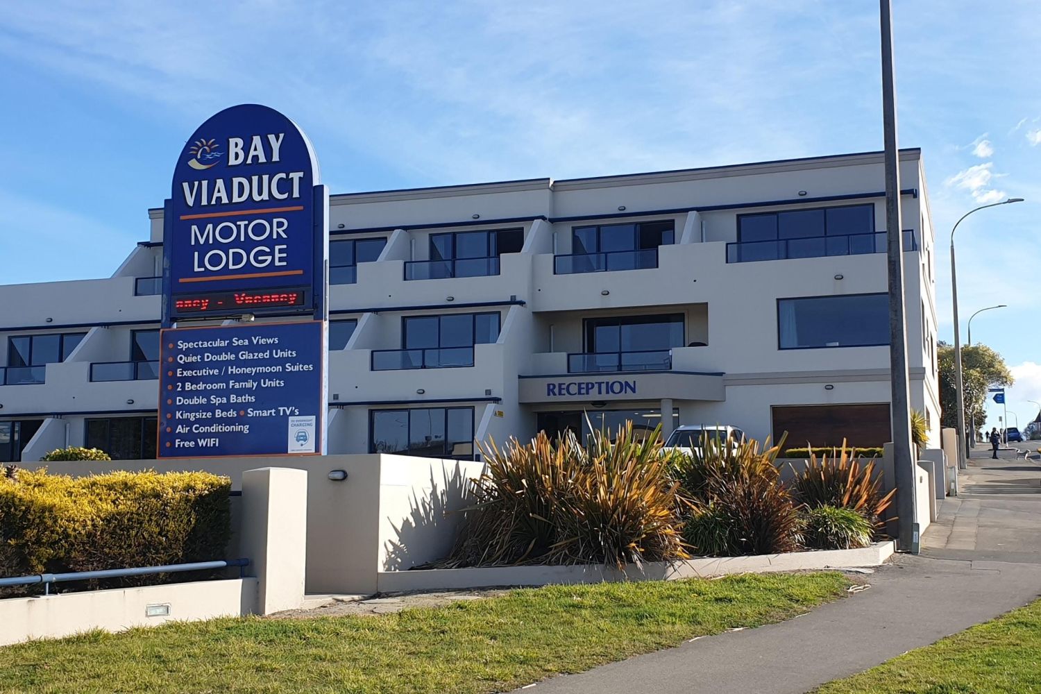 Boasting spectacular views out across Caroline Bay, the Bay Viaduct Motor Lodge is conveniently located within minutes from the Timaru CBD. All units are double glazed, with heat pumps. Most have a private patio overlooking the beach, double spa baths and a king size beds.